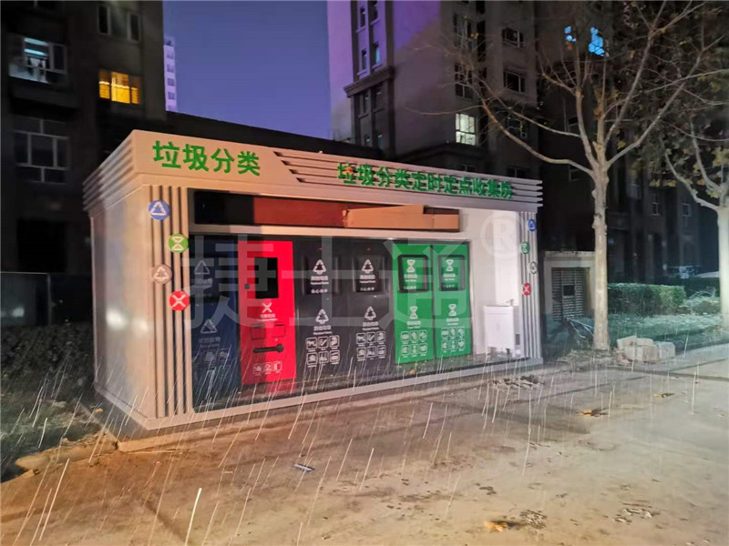 定時定點收集房,主要是用三個分類,根據(jù)物業(yè)調(diào)查及住戶數(shù)量,設(shè)生活垃圾兩個投放口,廚余垃圾兩個投放口,有害垃圾一個投放口,可回收垃圾一個口