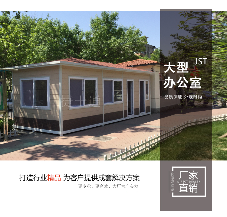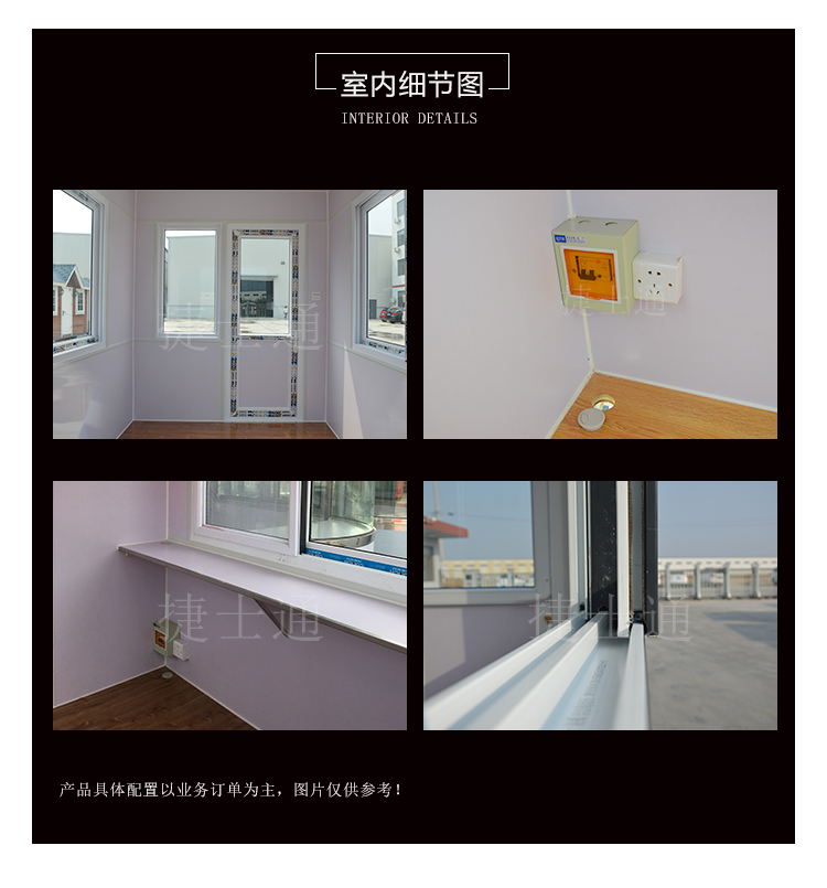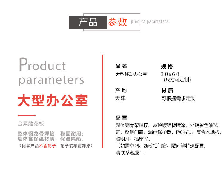 配置:整體鋼骨架焊接,屋頂鍍鋅板噴涂,外鋪彩色油氈瓦,塑鋼門窗、漏電保護器、PVC吊頂、復合木地板、照明燈、插座等。(如需空調、斷橋鋁門窗、隔間等特殊配置請聯系客服!)