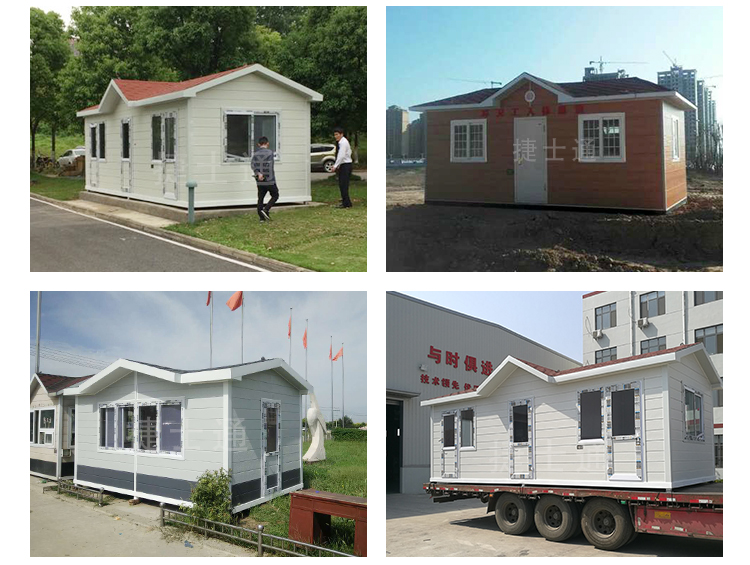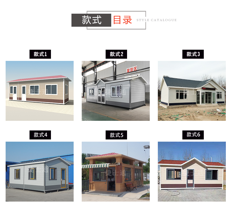 整體鋼骨架焊接,屋頂鍍鋅板噴涂,外鋪彩色油氈瓦,塑鋼門窗、漏電保護器、PVC吊頂、復合木地板、照明燈、插座等。