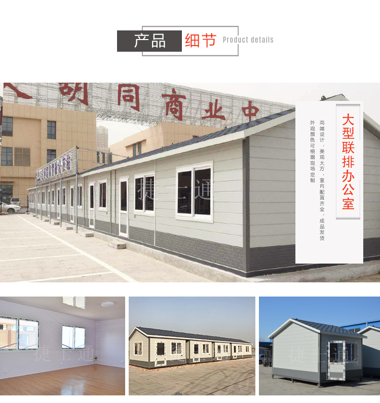 高速服務(wù)站可使用這種大型的戶外辦公室,由于土建不僅費(fèi)時(shí)費(fèi)力,還不環(huán)保,這種裝配式建筑,無需挖地基、使用鋼筋水泥等,只需和廠家確定好尺寸,讓使用位置的地面平整就可以,極其環(huán)保外觀可以根據(jù)您的想法或者根據(jù)您的思路,給您出設(shè)計(jì),出相對(duì)應(yīng)的圖紙,直到您滿意為止,服務(wù)客戶是我們的本職