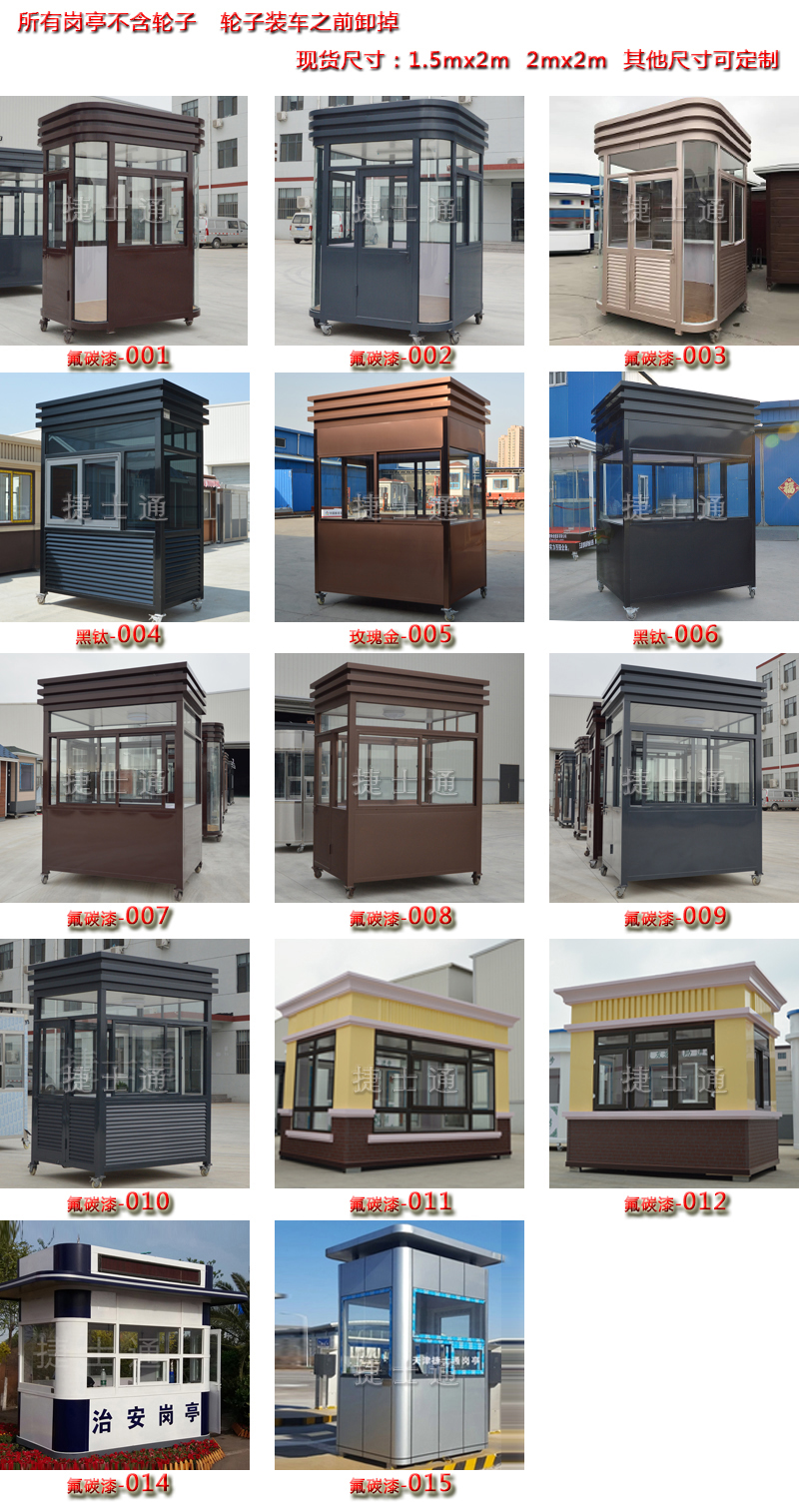 有氟碳噴漆崗?fù)ぃ薪饘俚窕ò鍗復(fù)?,有不銹鋼崗?fù)?,有售貨亭,有吸煙亭,需要的買家,請(qǐng)與客服聯(lián)系,并說(shuō)下崗?fù)さ木幪?hào),方便業(yè)務(wù)給您報(bào)價(jià)。