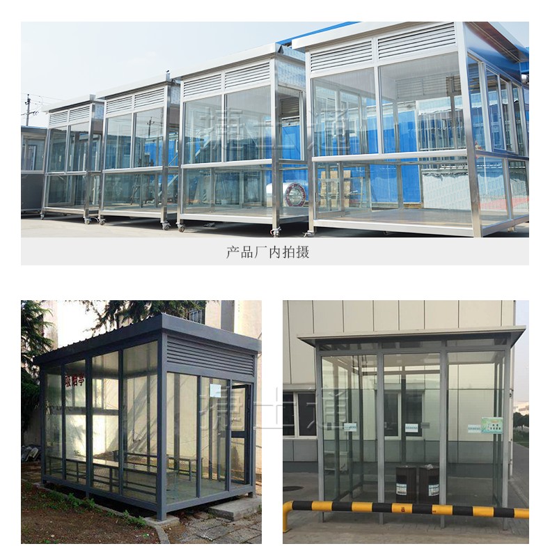 特點:崗亭整體方鋼龍骨焊接,穩(wěn)固耐用,崗亭內部可根據客戶需求定制,如工地吸煙亭等。
