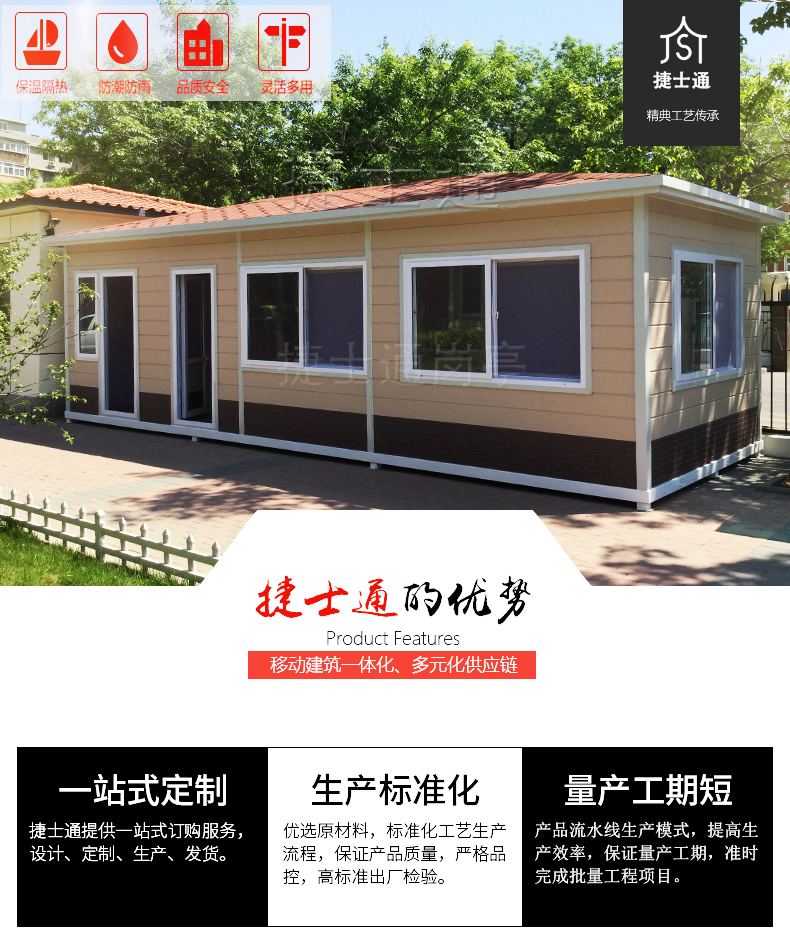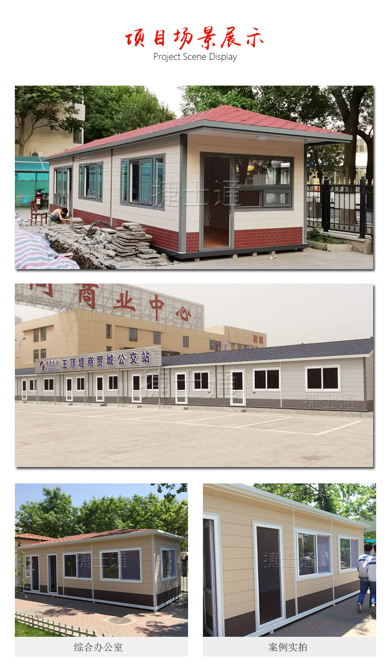 此款為大型戶外辦公室,采用方鋼龍骨焊接,優(yōu)質(zhì)外墻板,有專門的保溫隔熱層和完善的防水性能。