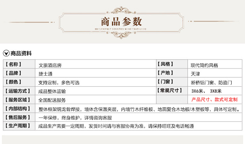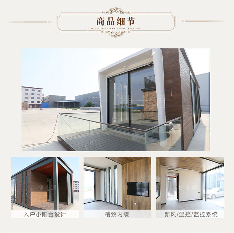 標(biāo)準(zhǔn)配置 :外墻:優(yōu)質(zhì)金屬雕花板/氟碳漆板/纖維水泥板可選。內(nèi)墻:復(fù)合木地板/竹木纖維板/木塑板......龍骨:優(yōu)質(zhì)鍍鋅方鋼龍骨焊接。室內(nèi)吊頂:優(yōu)質(zhì)PVC吊頂/納米纖維板可選。底座:鍍鋅方鋼焊接加黑竹木板模板。室內(nèi)地板:優(yōu)勢防滑鋁板/防滑瓷磚可選。門窗:斷橋鋁門窗、防盜門 。其他:照明、配電系統(tǒng)......可根據(jù)客戶需求進(jìn)行特殊定制。聯(lián)系電話:15822882616,公司網(wǎng)址:www.91porm.net。