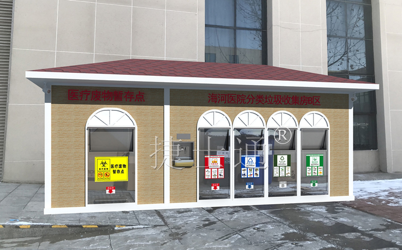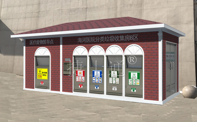 小區(qū)內(nèi)垃圾房擺放設(shè)置位置布局設(shè)計(jì)通過(guò)淡雅清新的裝修風(fēng)格帶給人視覺(jué)上的舒適感,畫面中的背景選擇在商場(chǎng)外部的空地上,灰紅磚塊色和米色的石磚堆砌成復(fù)古的方形垃圾屋,灰紅磚塊色的瓦片帶給人復(fù)古別致的美感體驗(yàn),外開(kāi)的房門設(shè)計(jì)簡(jiǎn)單方便,屋子內(nèi)部的地面上鋪設(shè)著白色的瓷磚地板,帶來(lái)干凈整潔的視覺(jué)體驗(yàn),紅色的塑料垃圾桶整齊的擺放在房間中間,讓人眼前一亮。