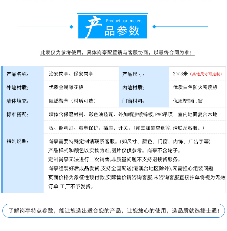 保安亭和警務(wù)室又有何異同呢?我們熟悉的保安崗?fù)ぞ褪且粋€小型崗?fù)?,一般都是龍骨焊接而成的,是保安人員工作、執(zhí)勤的地方。首先從外觀上,來看,警務(wù)室大多數(shù)以藍(lán)白相間為主,而保安崗?fù)た蛇x擇的風(fēng)格樣式就相對豐富很多,有不銹鋼、金屬雕花板、真石漆(噴砂崗?fù)ぃ┘扳伣饙復(fù)さ鹊?。而?/span>警務(wù)室作為公安部門的重要設(shè)施,會配備爆閃燈及LED顯示屏等,這些都是保安亭這類民用設(shè)施所不可采用的。治安崗?fù)?,已不同于傳統(tǒng)的治安崗?fù)ぃ滦偷闹伟矋復(fù)ぜF(xiàn)代化信息平臺于一體,不僅維護(hù)群眾人身安全,還有利于打擊違法犯罪。嚴(yán)肅的治安崗?fù)?,給人一種威懾作用,同樣,在群眾需要幫助的時候,*時間挺身而出,送去溫暖。廠家咨詢電話:15822882616,公司網(wǎng)址:www.91porm.net。